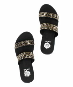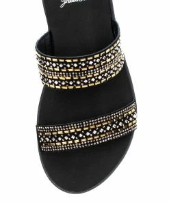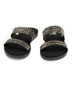 Chic slip-on sandal featuring shimmering rhinestone accents and a flexible rubber sole.