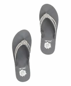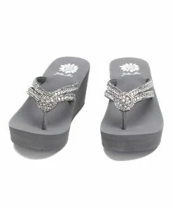 Chic wedge sandal featuring shimmering rhinestone accenting and a flexible rubber sole.