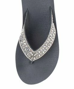 Sparkling slip-on sandals featuring criss-crossing, rhinestone-embellished straps and a flexible rubber sole.