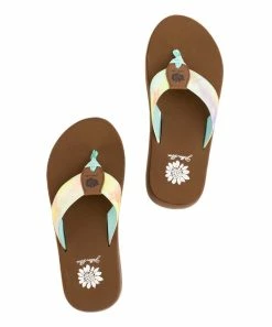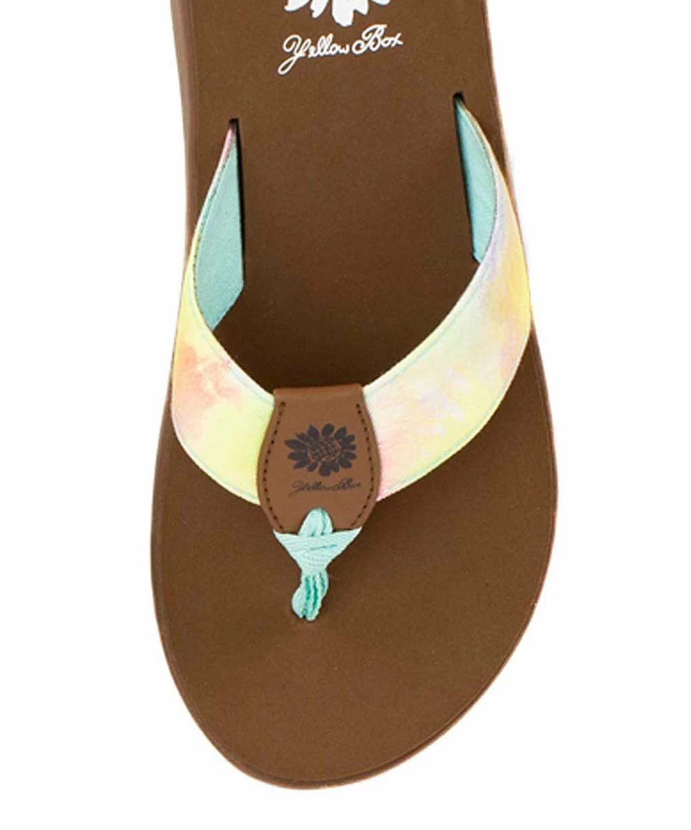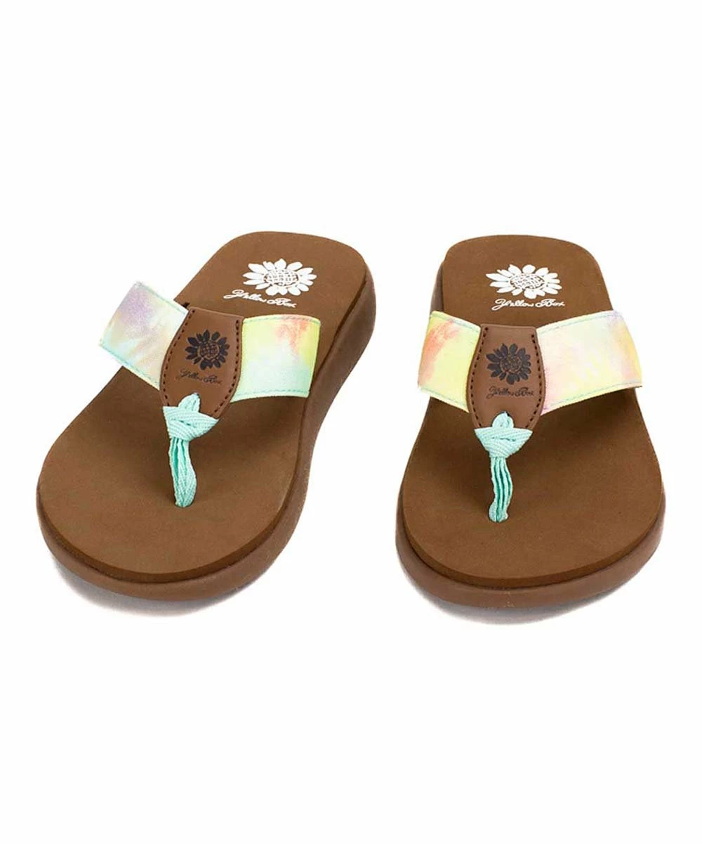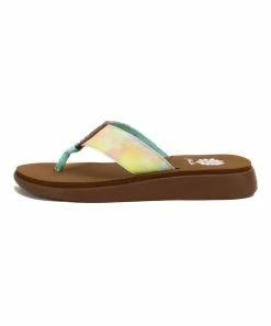 Platform sandal featuring a colorful upper and a flexible rubber sole.