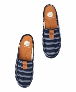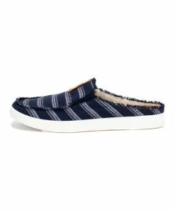 Show off chic style with every step wearing this backless sneaker in a stripe pattern and frayed hem details. Memory foam padding and plush terrycloth lining for added comfort.