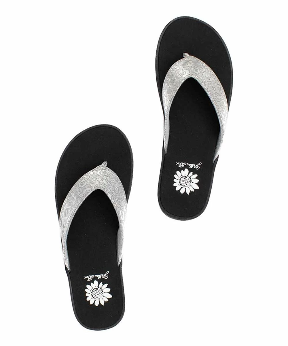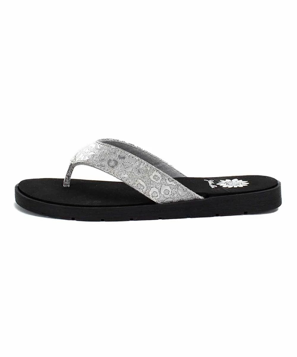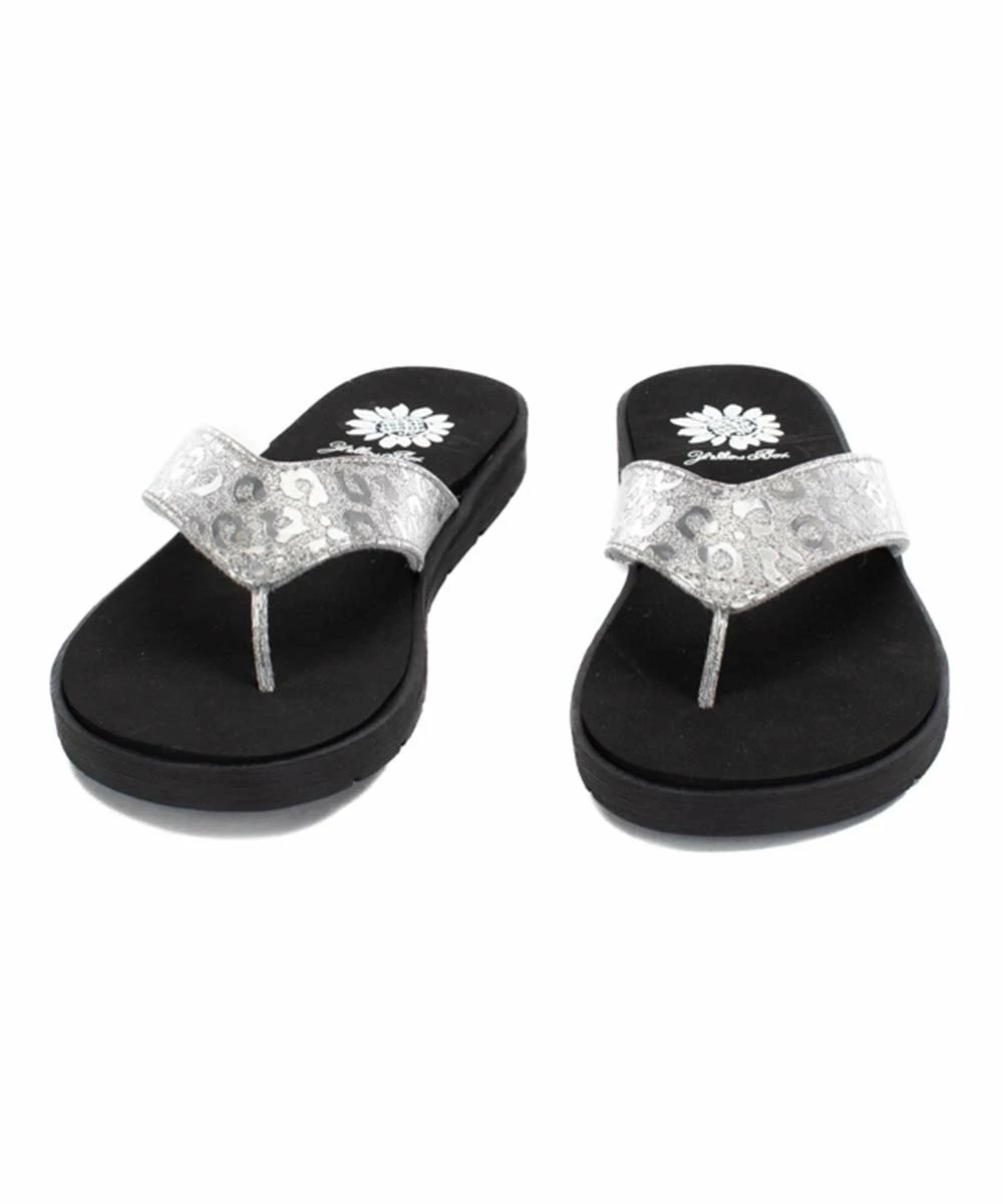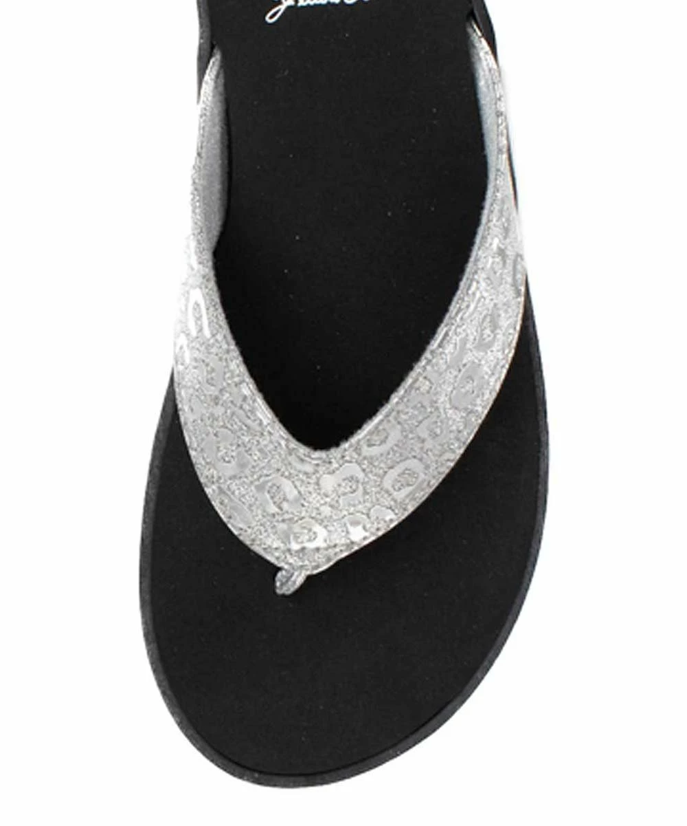Sparkling slip-on sandals featuring a wild leopard print and flexible rubber sole.