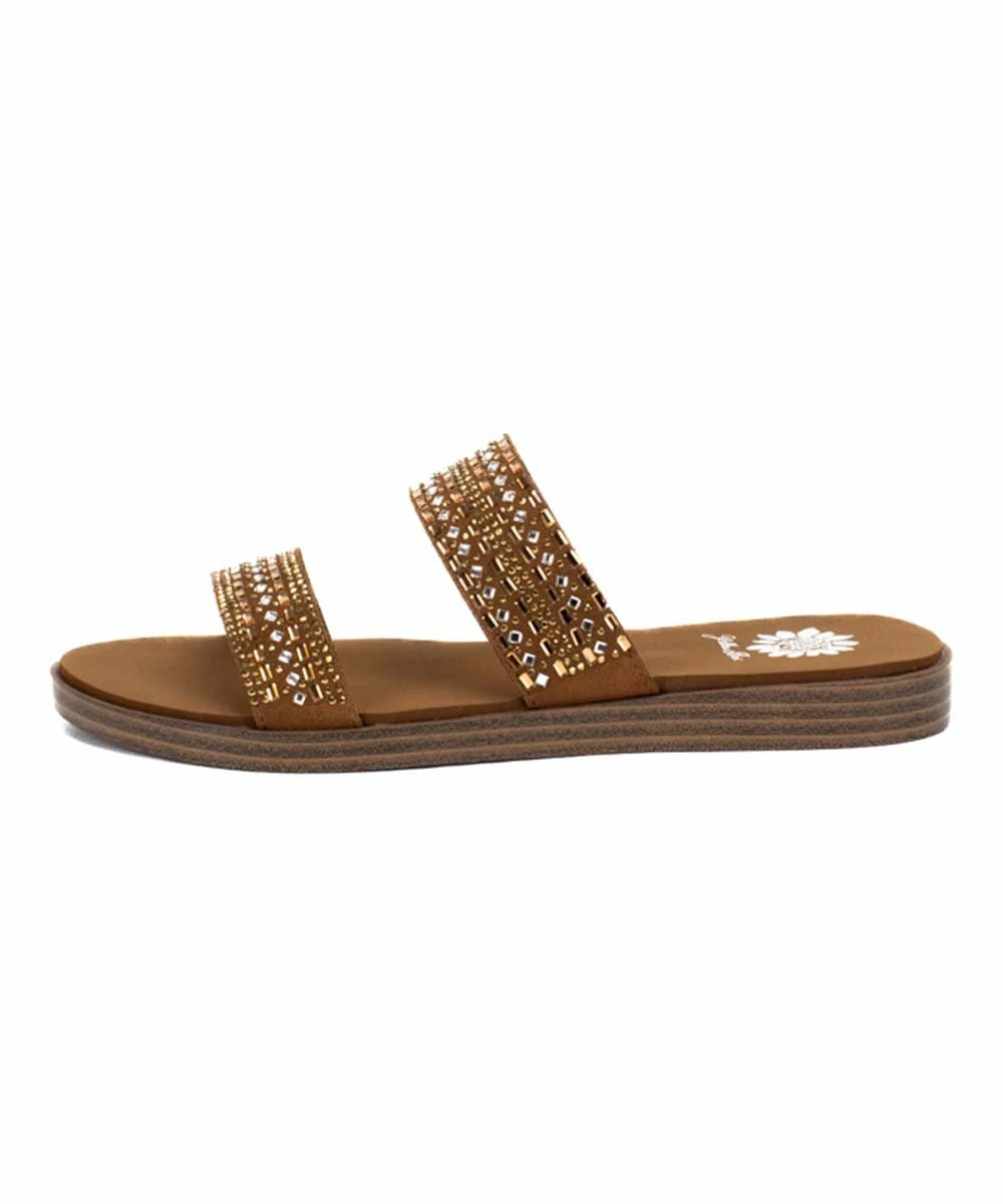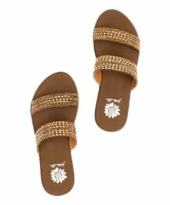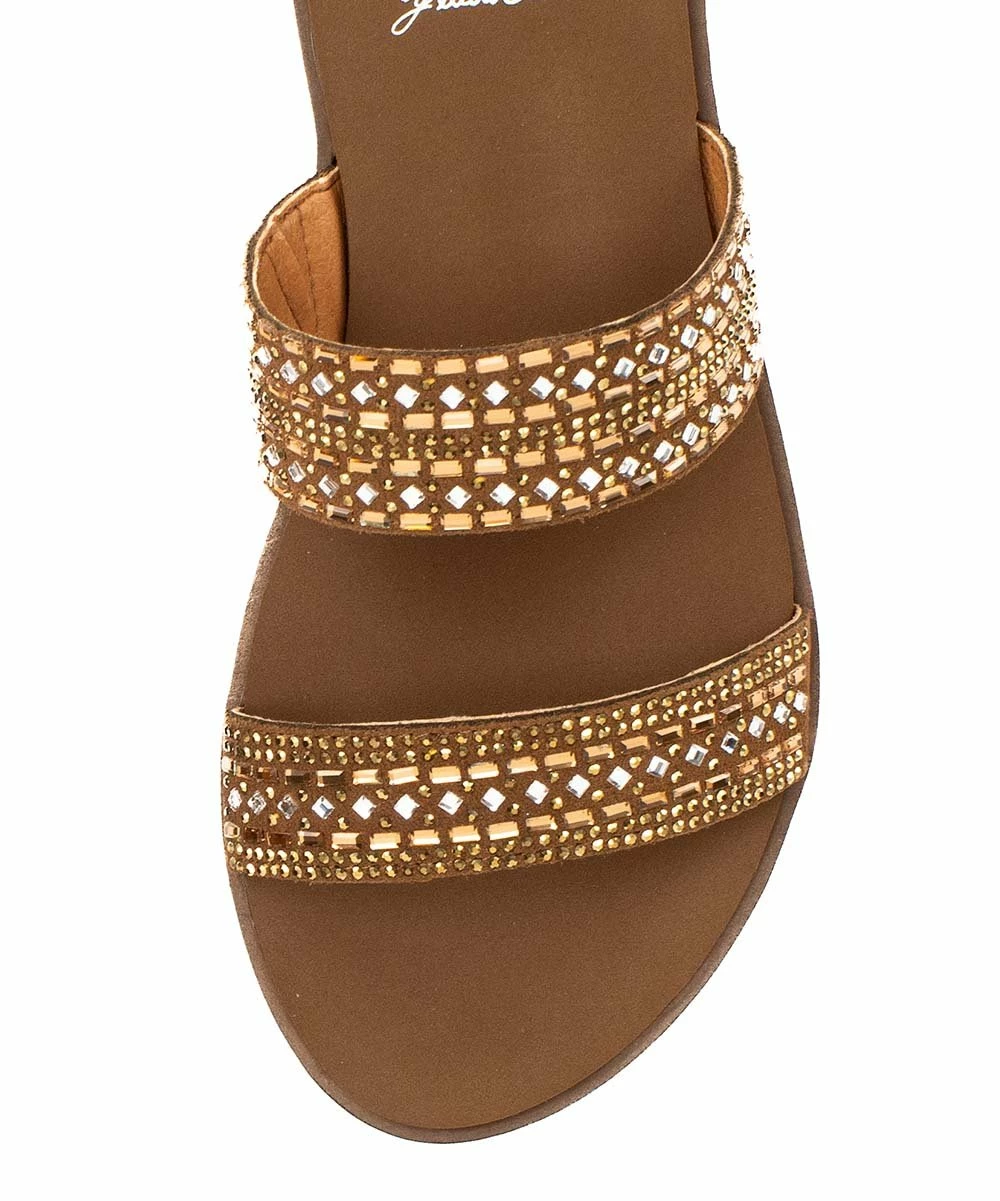 Chic slip-on sandal featuring shimmering rhinestone accents and a flexible rubber sole.