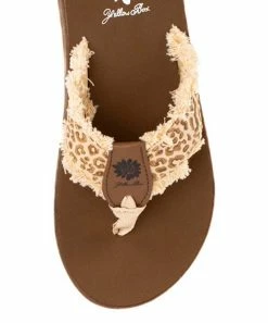 Easy slip-on sandal featuring a wild leopard print and frayed detailing. Flexible rubber sole.