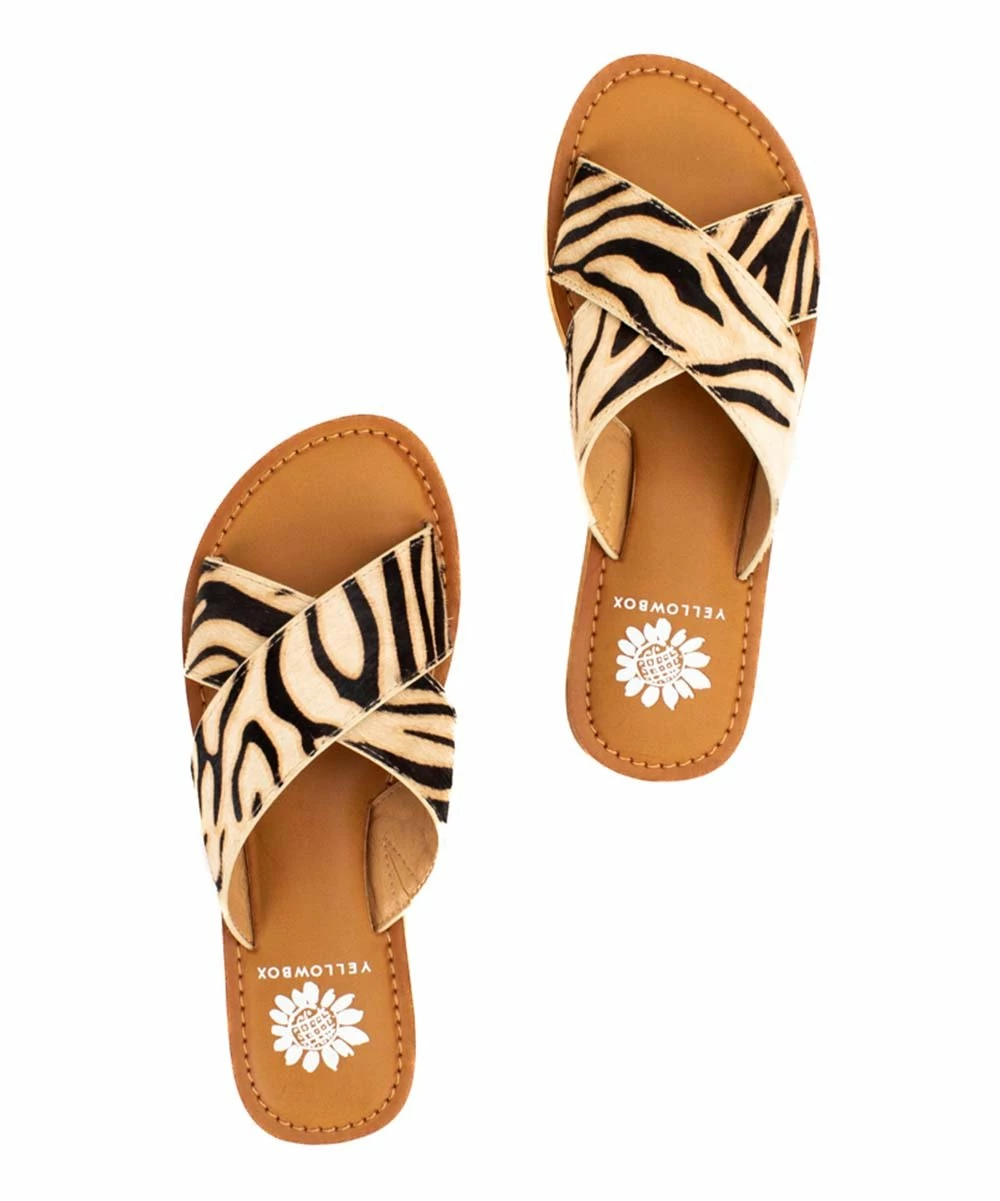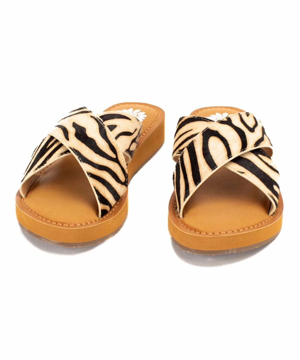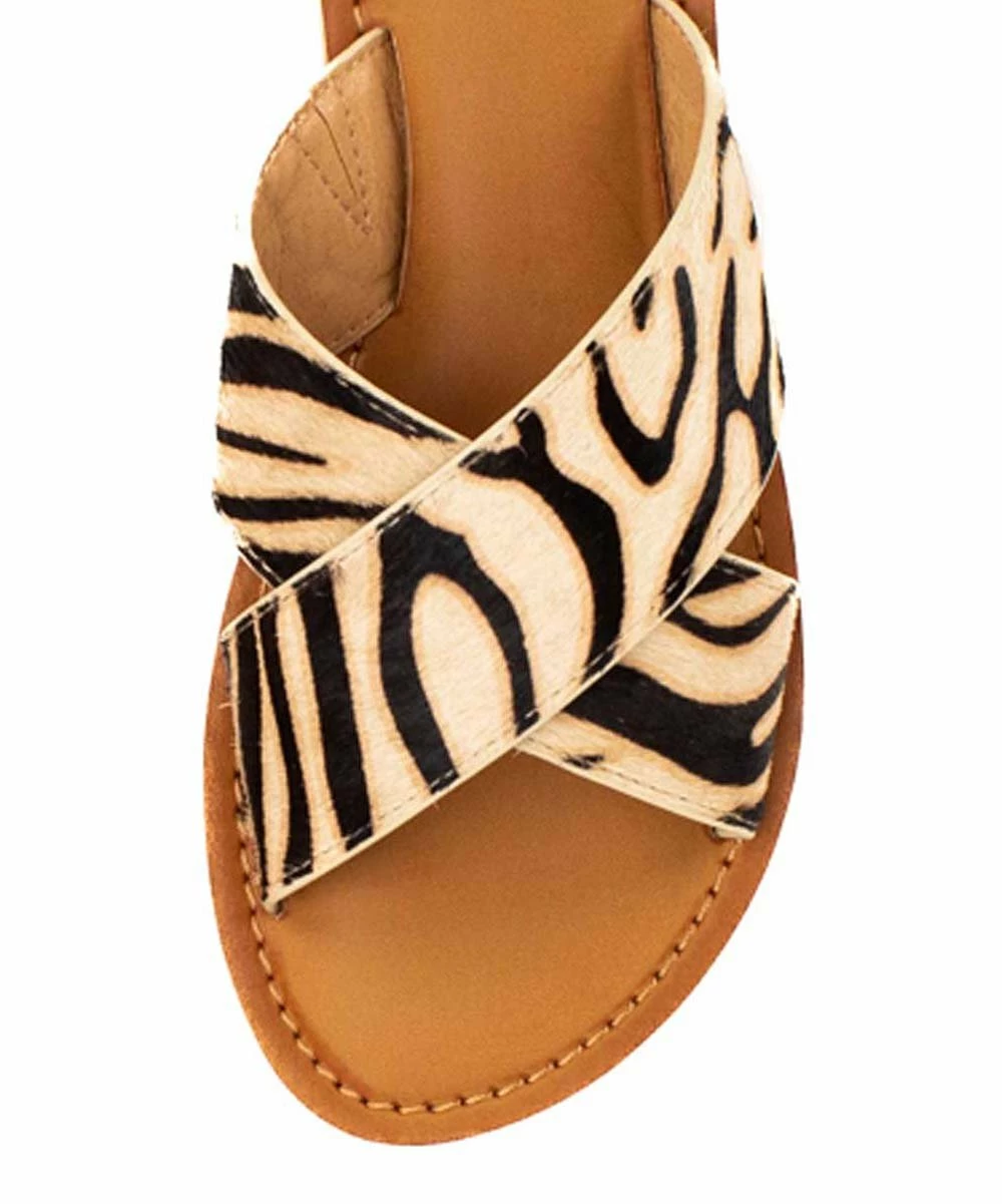 Leather slides featuring a chic crossed-strap design and flexible rubber sole.